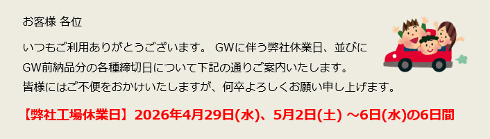 ゴールデンウィーク(以下GW)に伴う弊社出荷休業日、並びに、