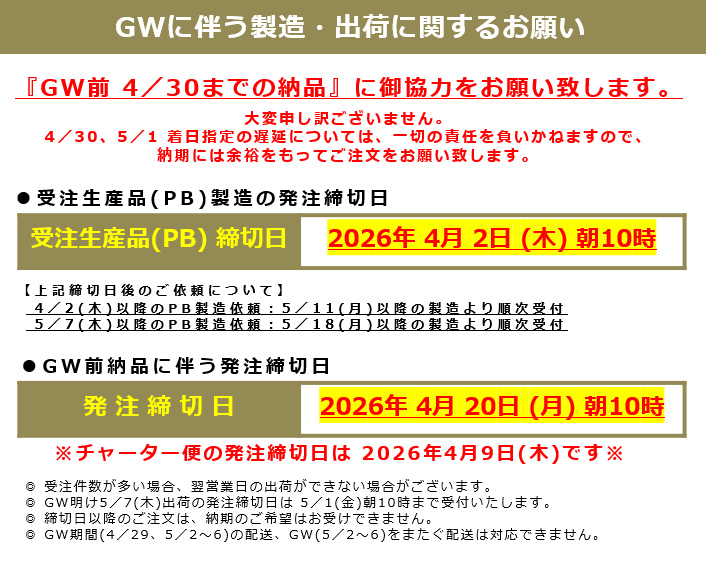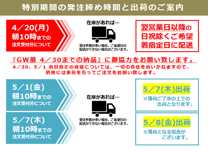 ◆◆ GWに伴うご注文締切日と出荷に関するお願い ◆◆